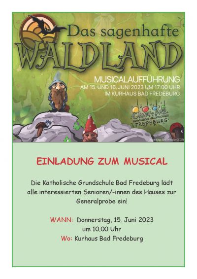 Die Katholische Grundschule Bad Fredeburg lädt alle Senioren/-innen des Hauses zur Generalprobe des Musicals "Das sagenhafte Waldland" in das Kurhaus Bad Fredeburg ein. Beginn: 10.00 Uhr